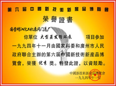 大型蒸發(fā)強(qiáng)制泵獲得第六屆高新技術(shù)產(chǎn)品優(yōu)秀獎(jiǎng)